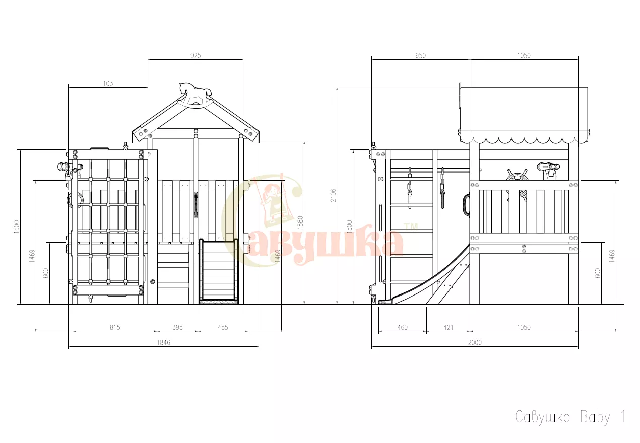 Дополнительный интерес вызывают игровые элементы: бинокль, руль, безопасные качели Growing Type 3в1 со спинкой и бортиками, бирюзовая горка, меловая доска, а также декоративный элемент на крыше "Корона".