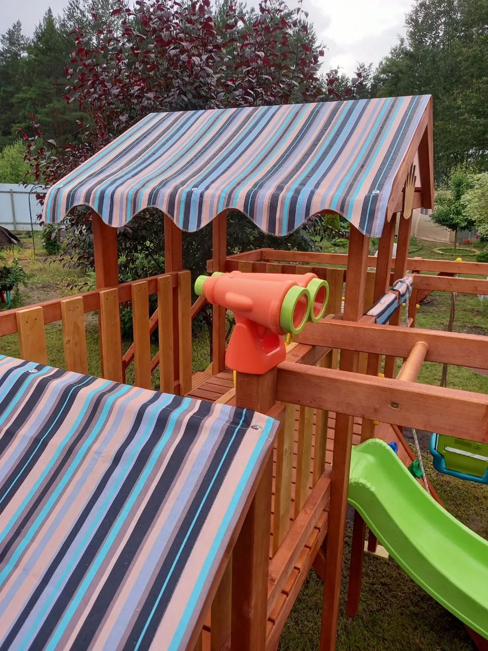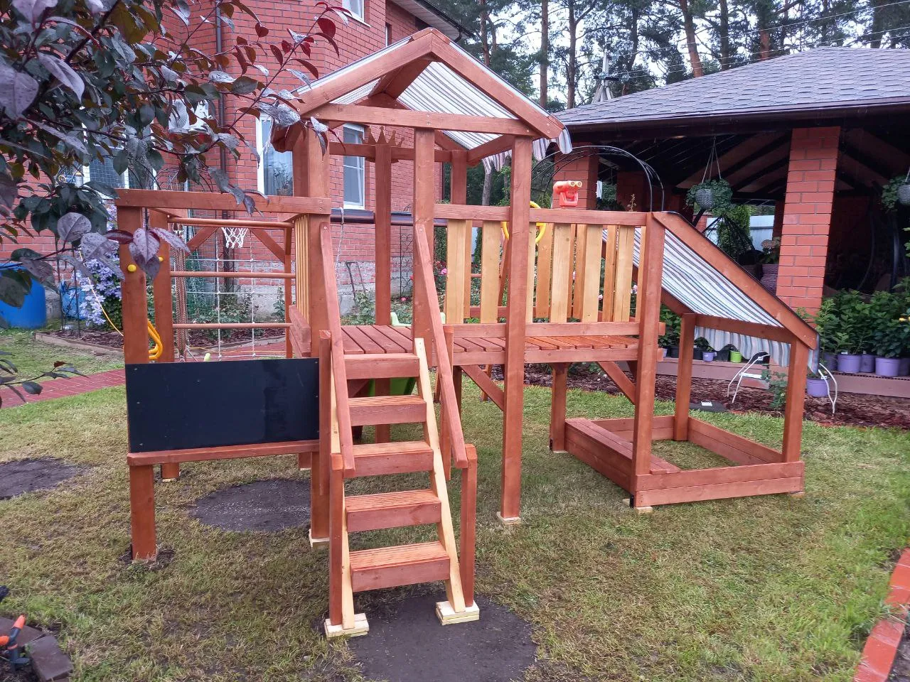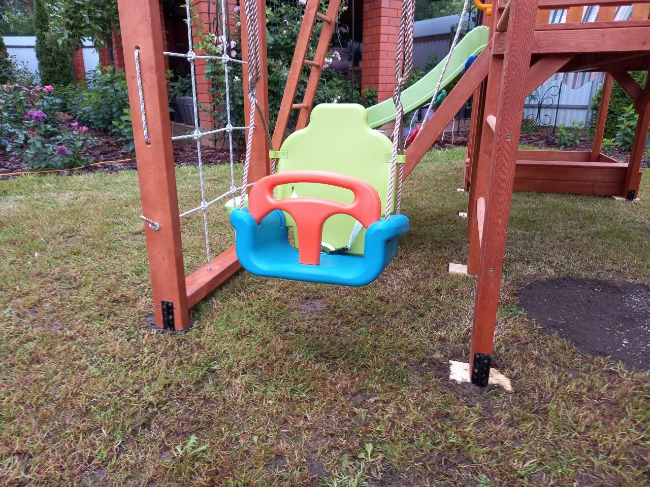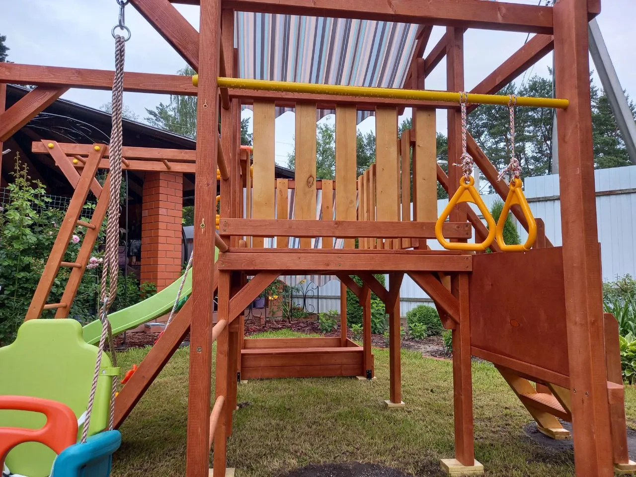 Каркас из натурального дерева защищен от дождя и снега двойным слоем краски. Она имеет водную основу, сертифицирована и полностью безопасна для детей.