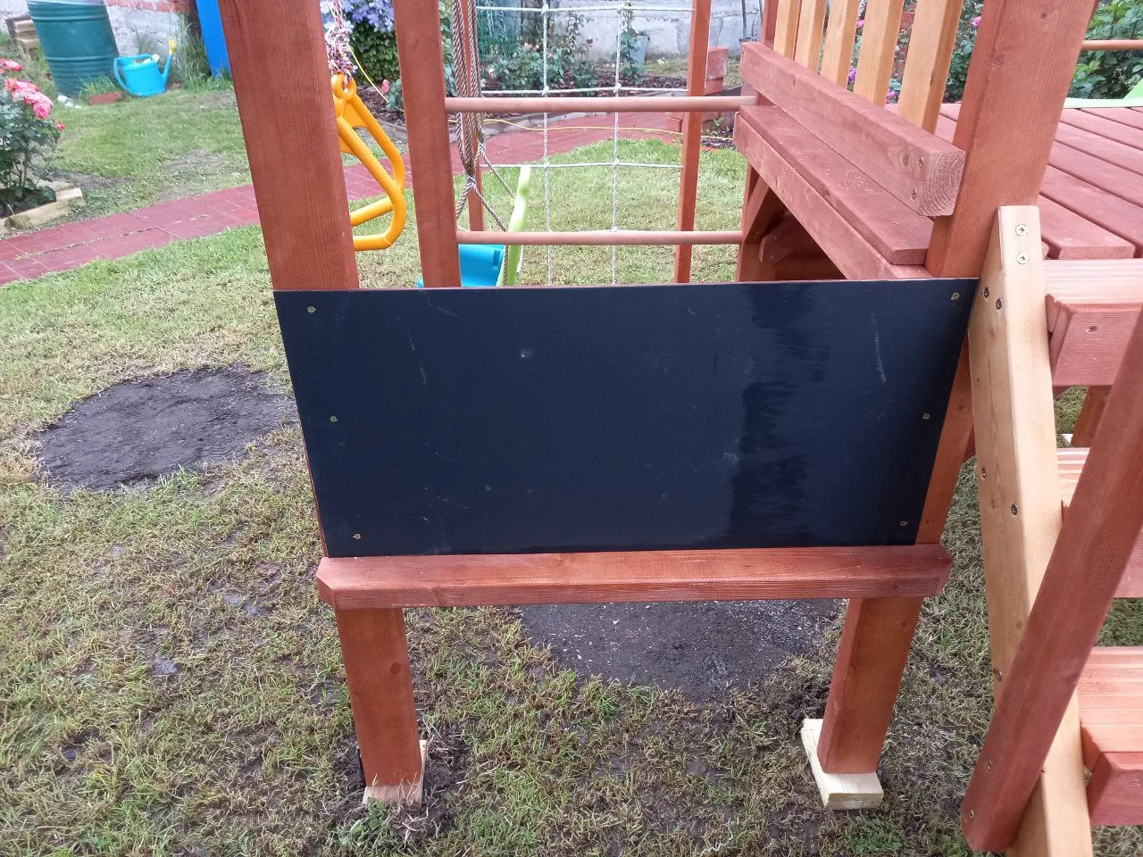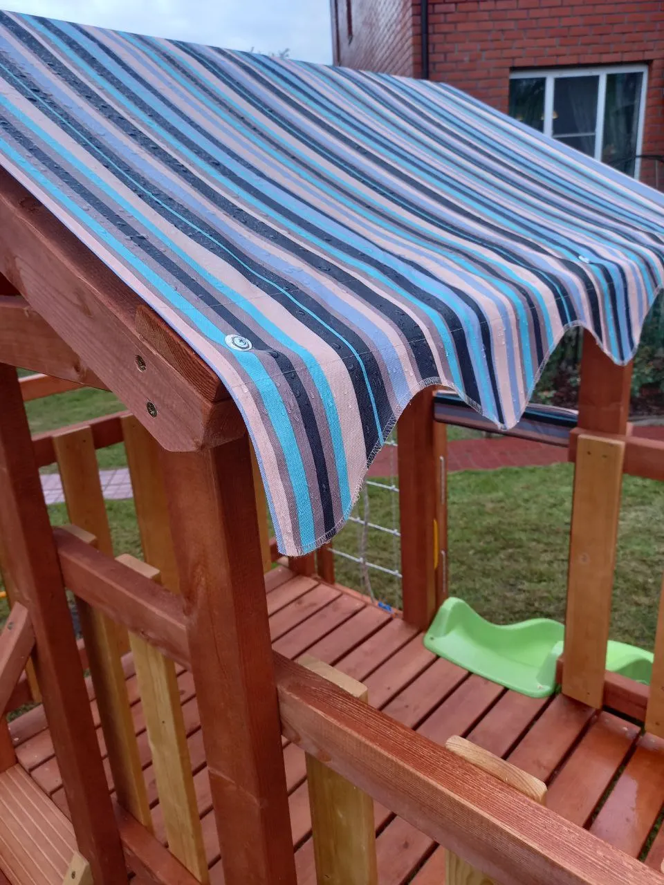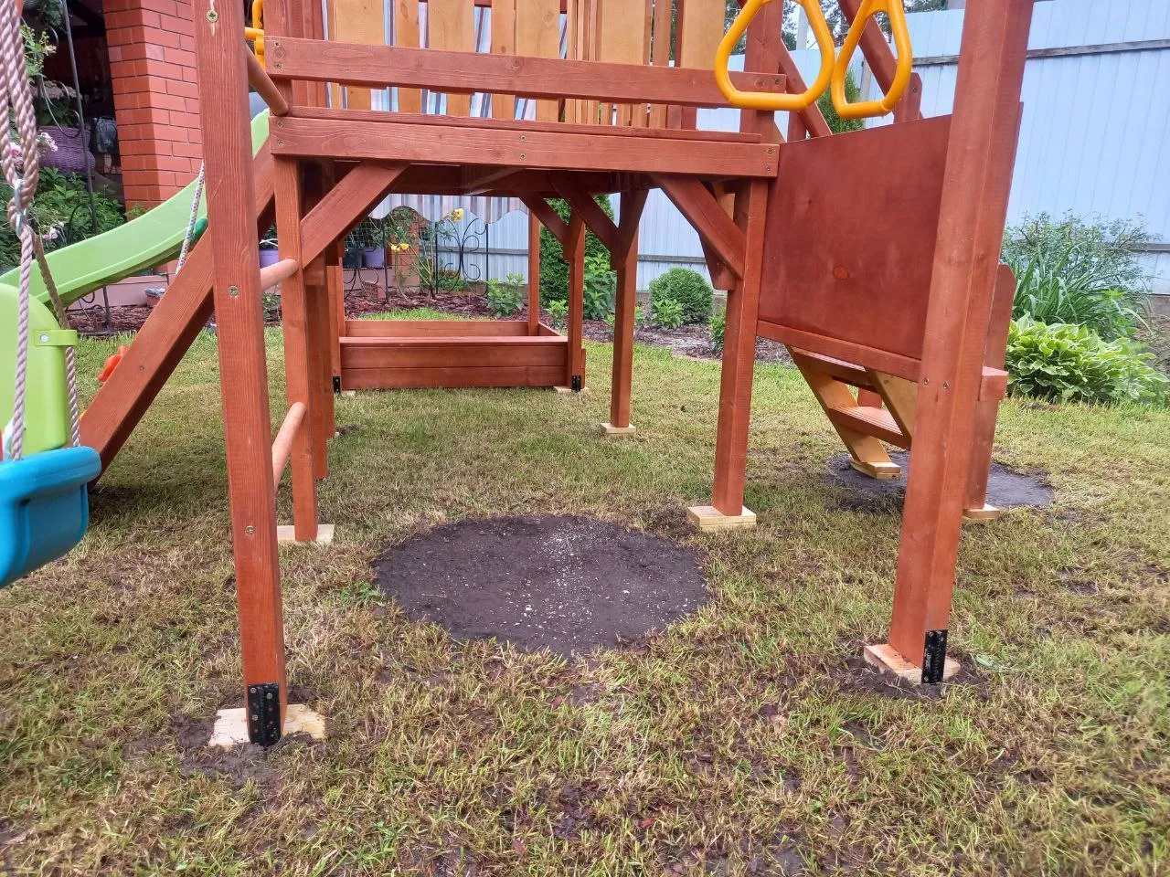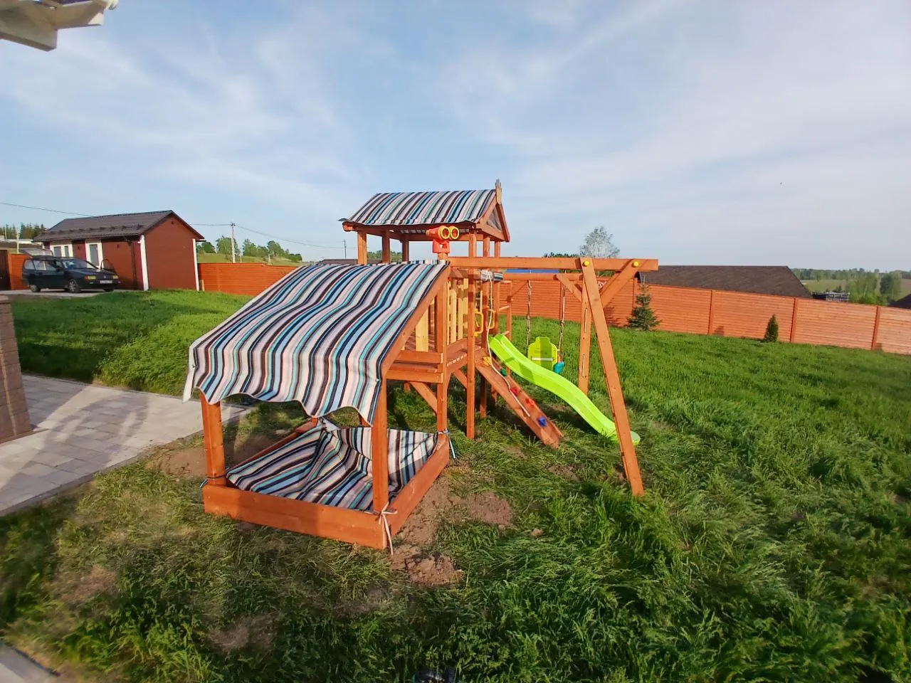 Каркас из натурального дерева защищен от дождя и снега двойным слоем краски. Она имеет водную основу, сертифицирована и полностью безопасна для детей.
