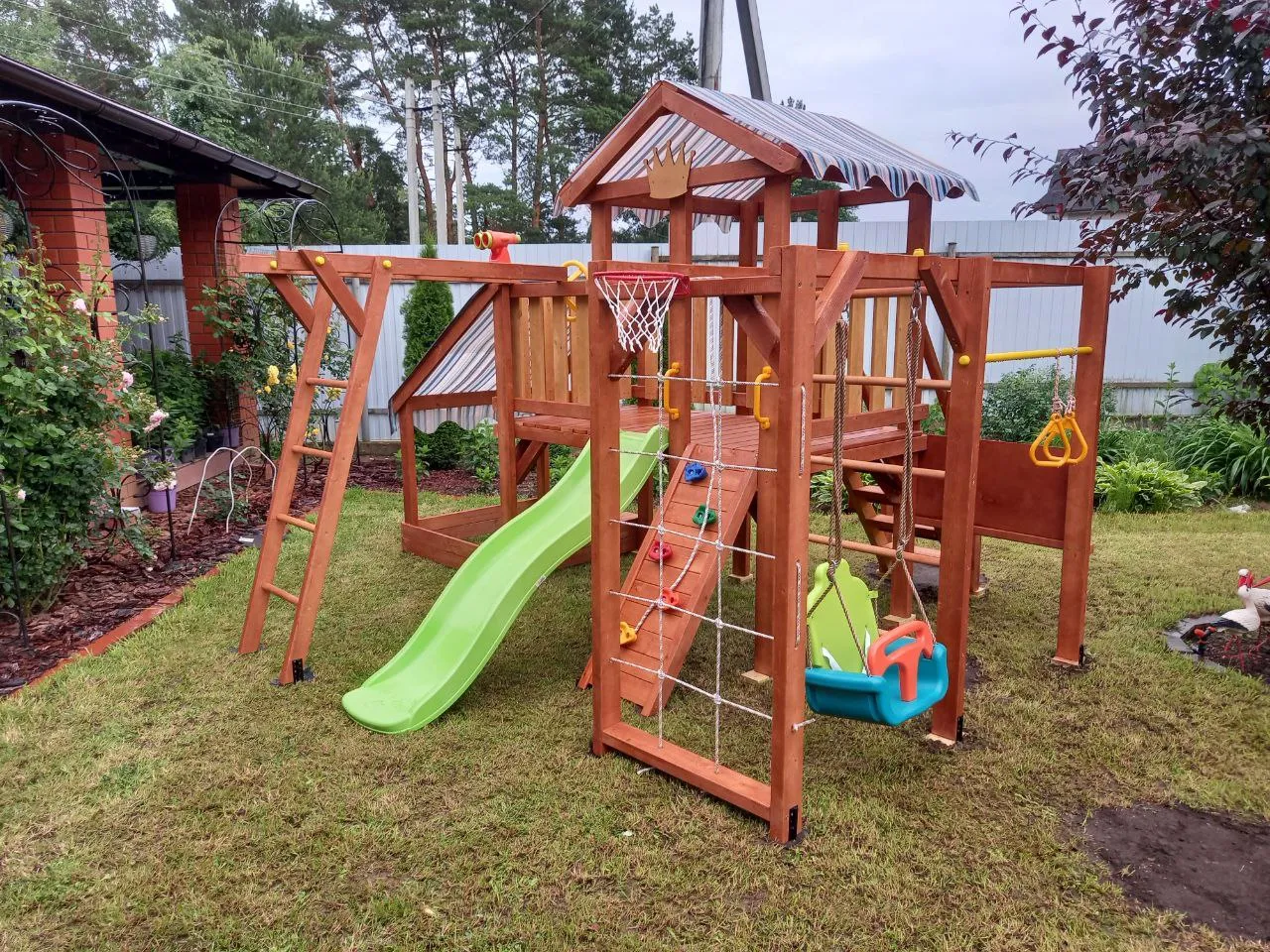Платформа домика высотой 90 см с балконом соединена со спортивно-развлекательной частью. Подняться в домик можно по скалодрому с канатом. Спуститься с платформы ваш ребенок также сможет через скалодром или по горке. Все стороны домика имеют деревянные ограждения. Спортивная секция включает 7 элементов: шведскую стенку, турник, гимнастические кольца, песочницу, сетку для лазанья, баскетбольное кольцо. В комплектацию также включен рукоход – по нашему опыту это один из самых любимых элементов у детей. Мальчики и девочки, занимаясь на нем, становятся сильнее, выносливее, развивают координацию. Игровые детали уличного комплекса вызывают дополнительный интерес у малышей. К ним относятся бинокль, руль, безопасные качели Growing Type со спинкой и бортиками, бирюзовая горка, меловая доска, а также декоративный элемент на крыше "Корона".