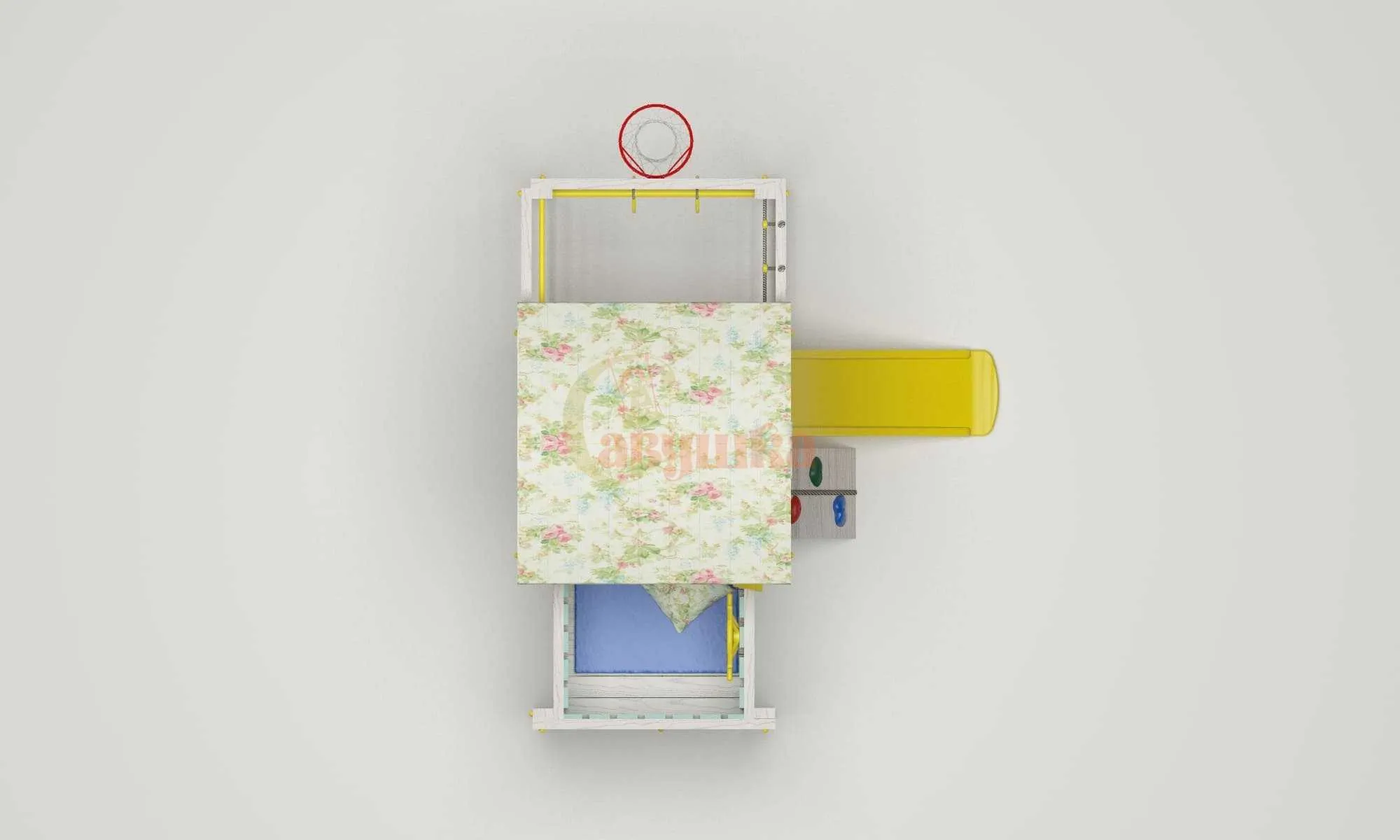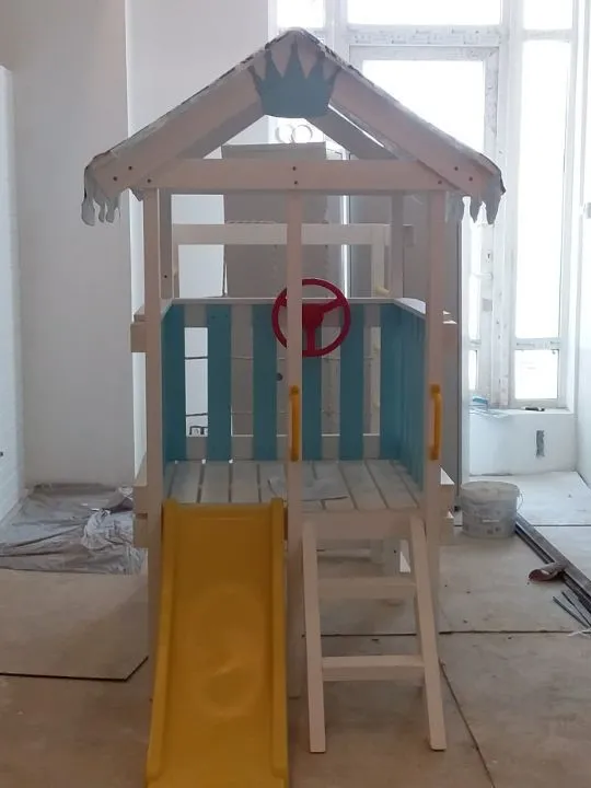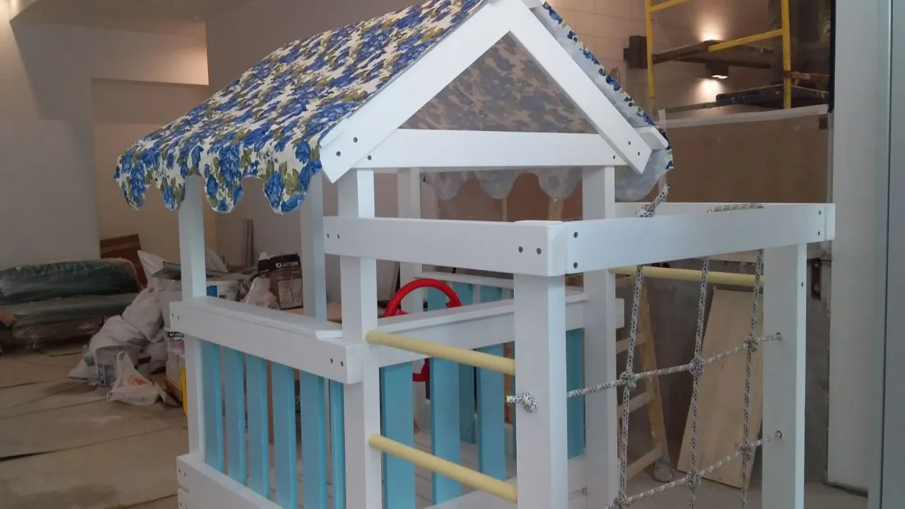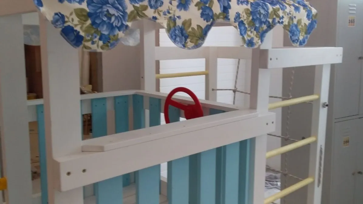 Это универсальный спортивно-игровой комплекс для очень активных детей. Для игр мы предусмотрели уютный домик с крышей и полупрозрачным тюлем белого цвета. Он стоит на платформе высотой 60 см. Чтобы попасть в него вашим малышам потребуется проявить смелость и упорство. Надо преодолеть мини-скалодром с канатом и пластиковыми зацепами- отличная тренировка для мышц и развития координации.Выйти из него можно спустившись вниз по 118-сантиметровой горке. Также предусмотрен балкон. Выйдя на него, ваш ребенок сможет покрутить штурвал или воспользоваться биноклем. При размещении матрасика – комплекс будет служить для ребенка спальным местом. Спортивный сектор состоит из сетки-лазалки, турника (тренирует мышцы груди и рук), шведской стенки и гимнастических колец. Бонусом к ним идет баскетбольная корзина - с ее помощью ребенок научится играть в команде.