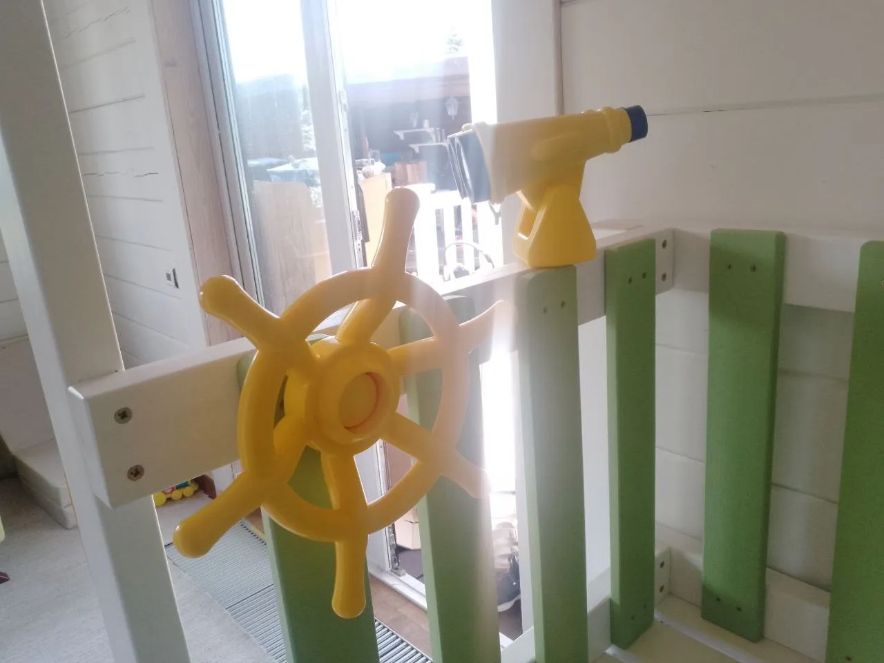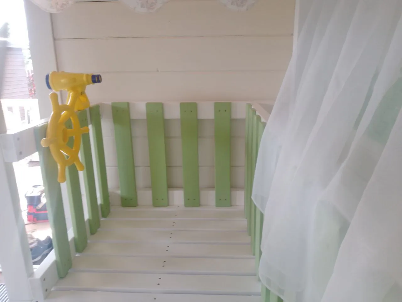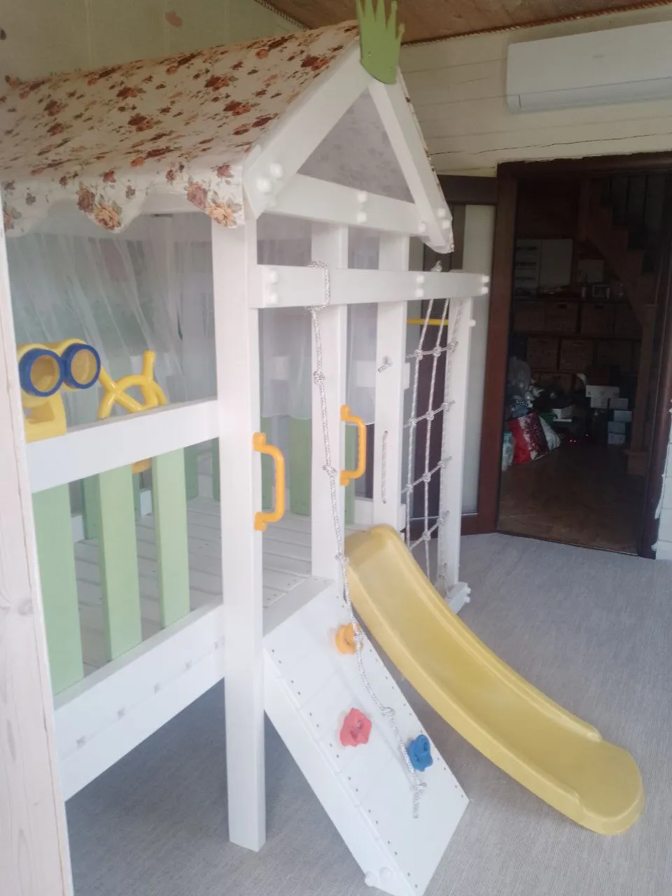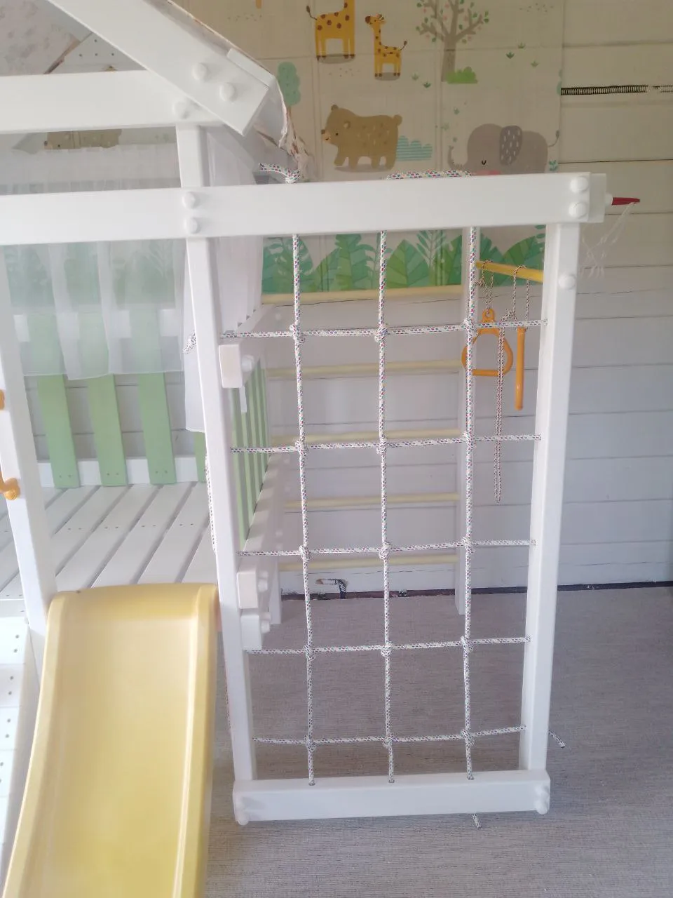 Это универсальный спортивно-игровой комплекс для очень активных детей. Для игр мы предусмотрели уютный домик с крышей и полупрозрачным тюлем белого цвета. Он стоит на платформе высотой 60 см. Чтобы попасть в него вашим малышам потребуется проявить смелость и упорство. Надо преодолеть мини-скалодром с канатом и пластиковыми зацепами- отличная тренировка для мышц и развития координации.Выйти из него можно спустившись вниз по 118-сантиметровой горке. Также предусмотрен балкон. Выйдя на него, ваш ребенок сможет покрутить штурвал или воспользоваться биноклем. При размещении матрасика – комплекс будет служить для ребенка спальным местом. Спортивный сектор состоит из сетки-лазалки, турника (тренирует мышцы груди и рук), шведской стенки и гимнастических колец. Бонусом к ним идет баскетбольная корзина - с ее помощью ребенок научится играть в команде.