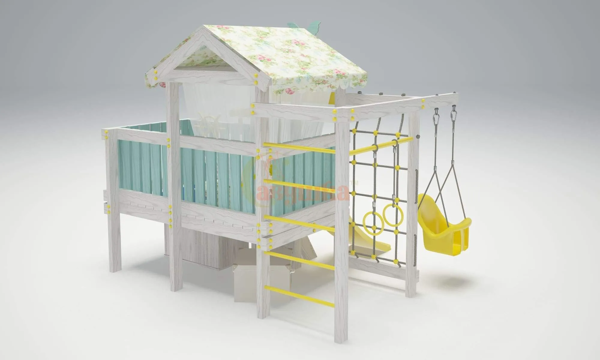 «Савушка Baby-6» станет хорошим вариантом для дачи или квартиры! В комплектацию входит домик с балконом и крышей, расположенный на платформе, на высоте 60 см от пола и спортивная зона. Благодаря белоснежному легкому тюлю ваши малыши будут чувствовать себя уютно и спокойно в домике.