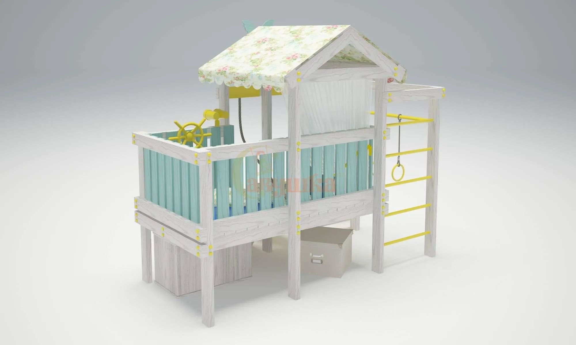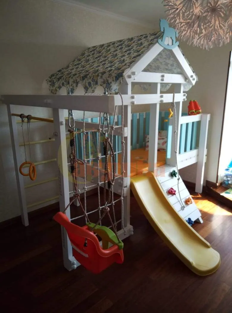 При желании его можно оборудовать под кровать, а в свободном пространстве снизу удобно хранить коробки с вещами и игрушками. Вход наверх - по пластиковым зацепам мини-скалодрома. Канат позволит вашему ребенку развить силу рук.