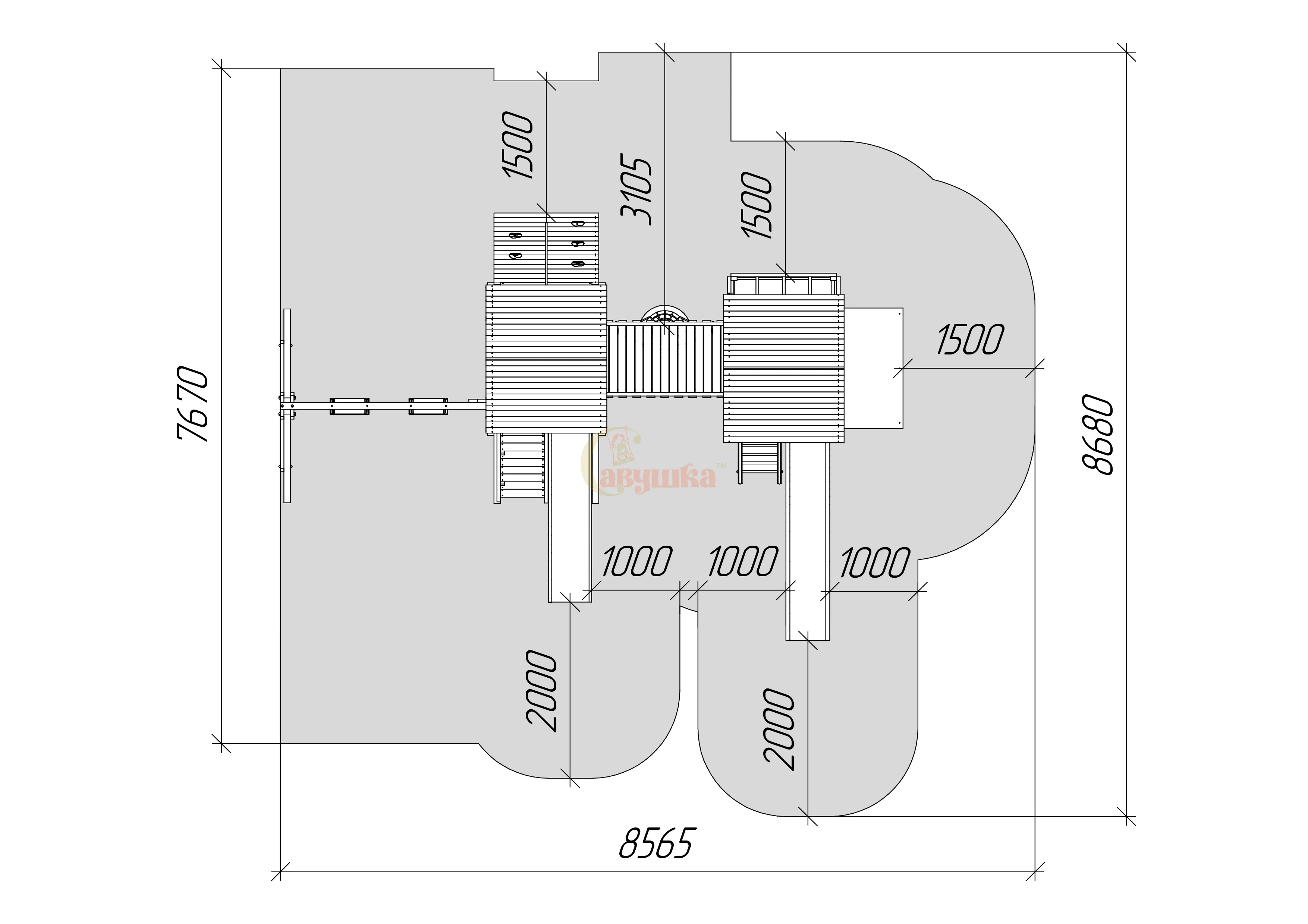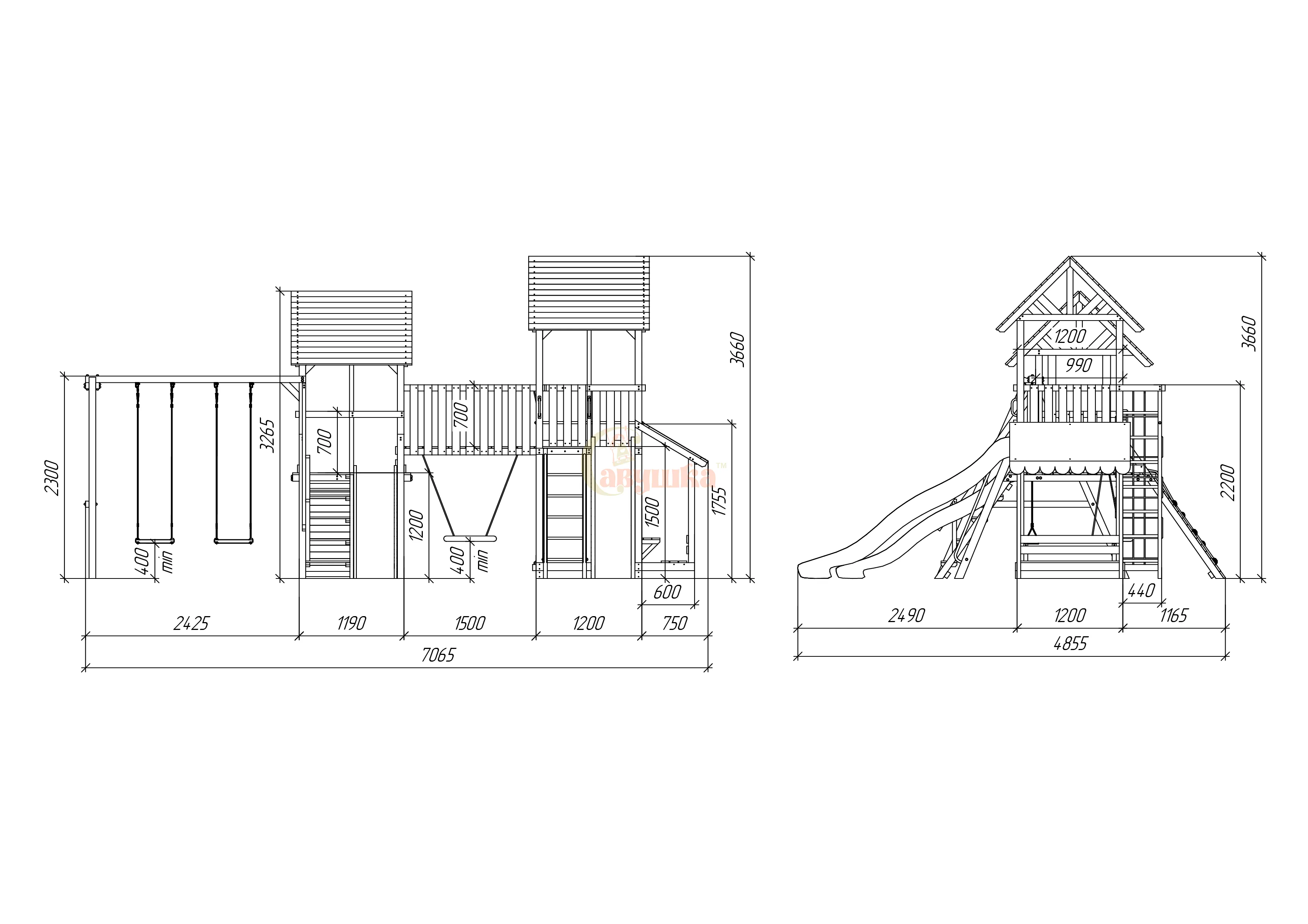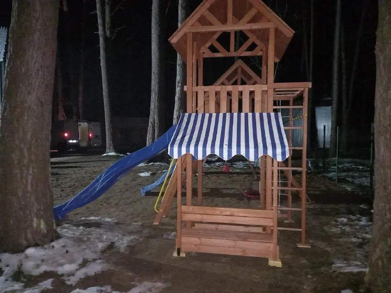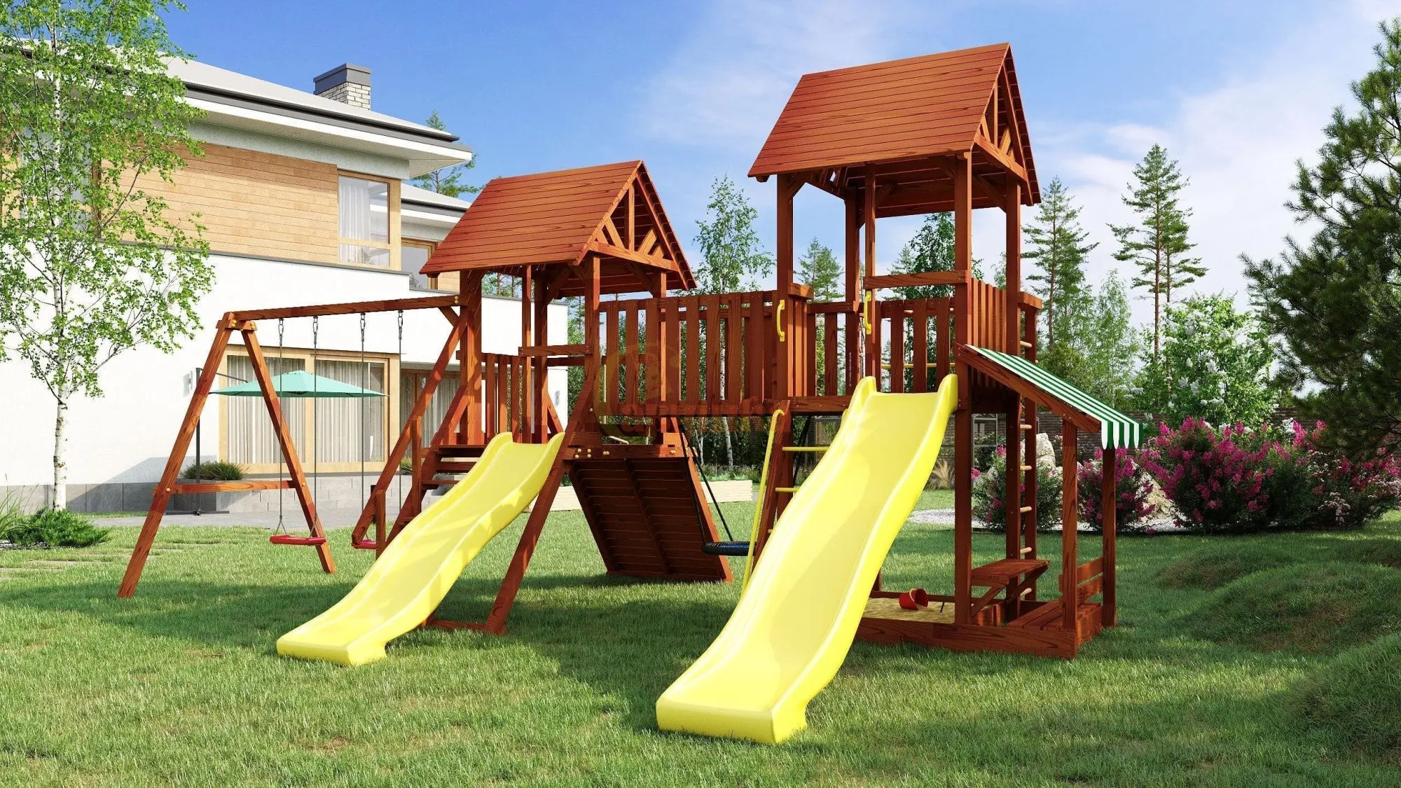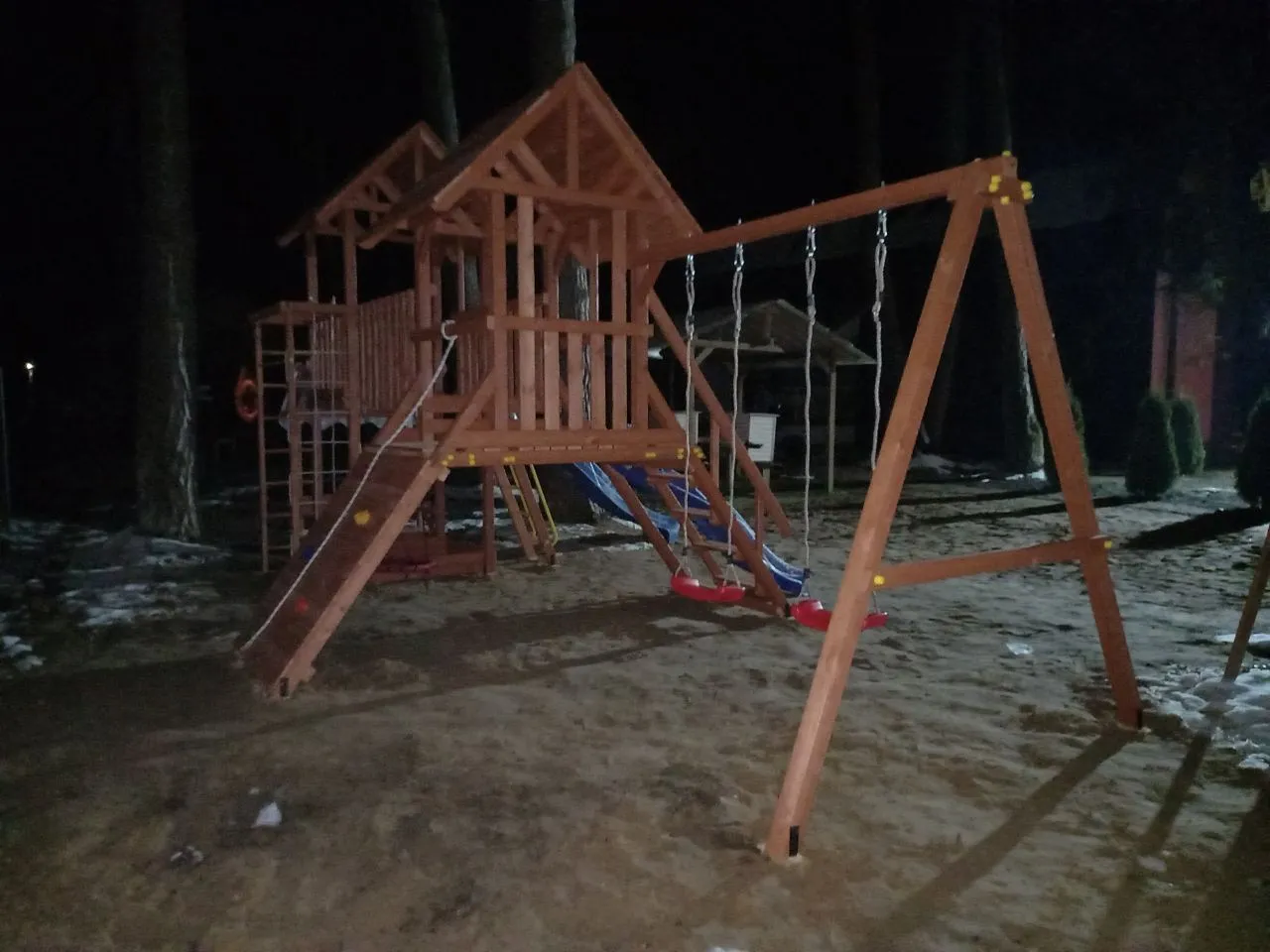 Конструкция выполнена из надежного клееного бруса, соответствующего стандартам безопасности. Все металлические соединения закрыты пластиковыми заглушками, что делает площадку максимально безопасной для малышей.