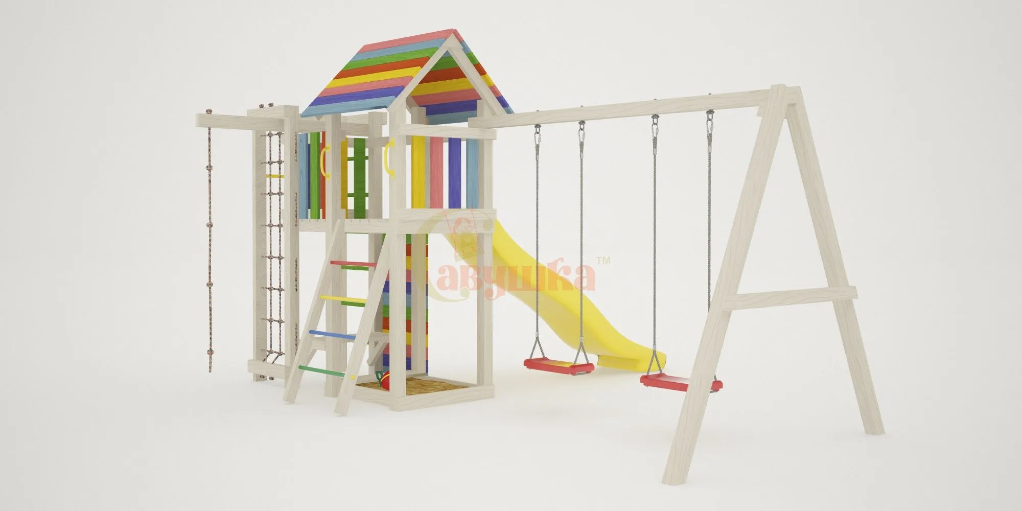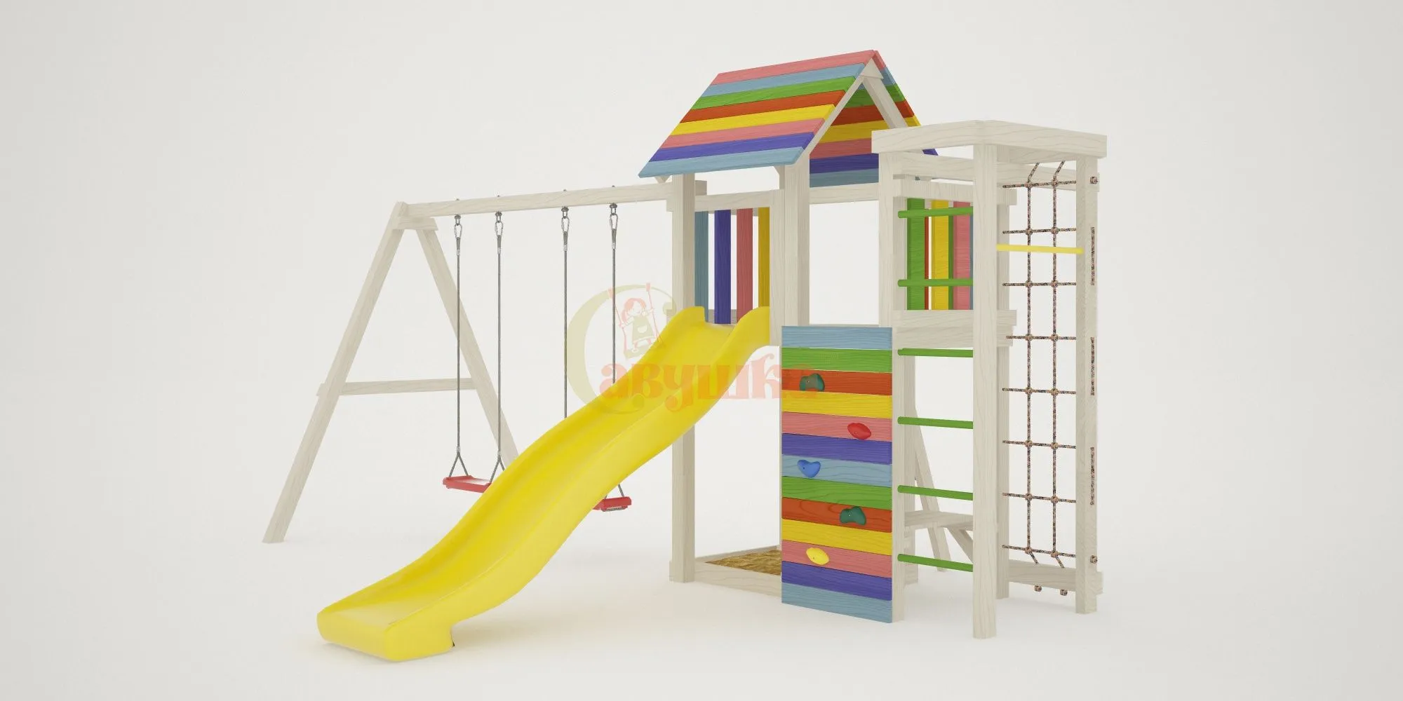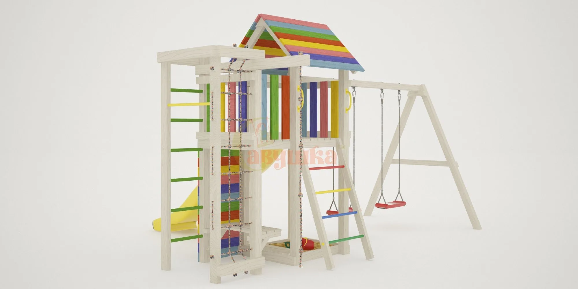 Отдельного внимания заслуживают спортивные элементы: турник, сетка-лазалка и канат. Они позволят весело заниматься физической подготовкой. Под платформой размещены песочница и лавочка. Точно никогда не будут пустовать качели Лодочка.