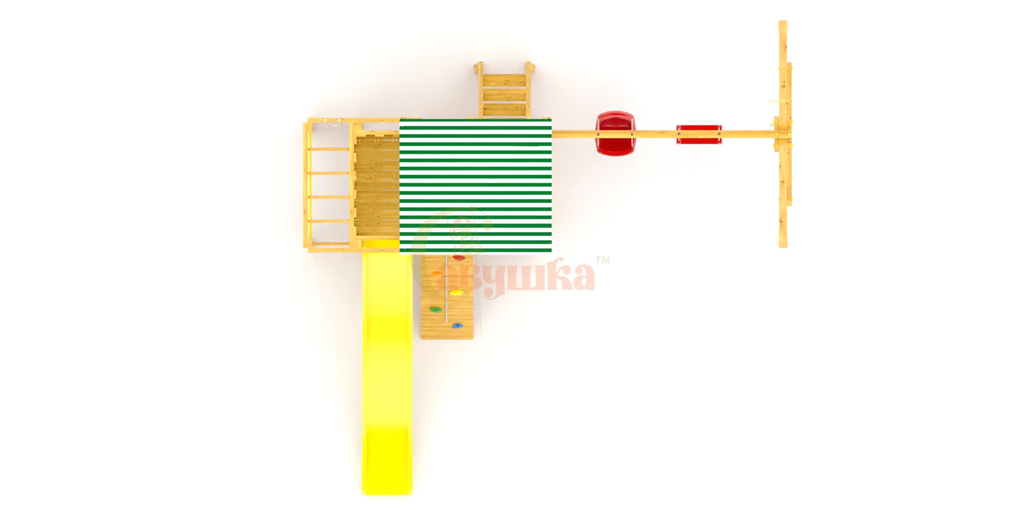 Игровая башня – центр спортивного строения с платформой на уровне 1200 мм от земли. Внизу расположилась песочница размером 1.29 м х 1.29 м и лавочка. В развитии силовых показателей помогут шведская стенка, сетка-лазалка, турник и рукоход.Подняться наверх детки могут по деревянной лестнице или более сложным способом – вскарабкаться по скалодрому с канатом, который оснащен удобными выступами для ножек. С пристроенного балкончика откроется хороший вид на весь загородный участок.