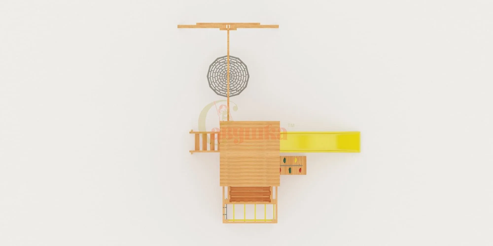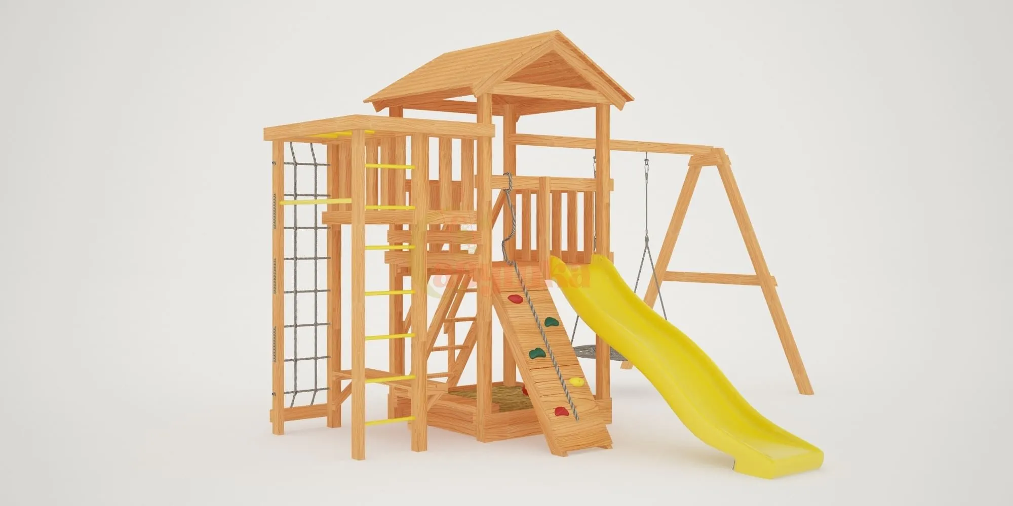 Эту современную детскую площадку оценят активные дети, которые ни минуты не могут усидеть на месте. Целый набор гимнастических снарядов позволит укрепить мышечный каркас, натренировать ловкость и силу. К ним относятся шведская стенка, турник, рукоход и сетка-лазалка. Металлические элементы инвентаря приятные на ощупь, они покрыты порошковой краской и имеют увеличенную толщину стенок.Также можно поиграть в песочнице, отдохнуть на лавочке, подняться на башню по деревянной лестнице, устроить игру на балкончике, а потом спуститься вниз с горки и полетать на волшебных качелях. Огромный выбор развлечений: увидев в первый раз этот комплекс, детки даже теряются – хотят попробовать все и сразу.