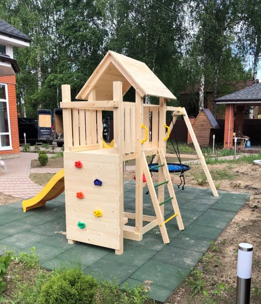 В Мастер 9 одновременно помещается целая команда. Выбор развлечений большой: любимые всеми детьми качели «Лодочка» х 2 (возможна замена на модель со спинкой или Trix), яркая горка длиной более двух метров, альпинистская стенка с комфортными выступами. И это еще не все.Внизу башни песочница со скамейкой, наверху - расширенный балкон для игр. Забраться наверх можно по наклонной лестнице с металлическими ступеньками. Все эти простые снаряды увлекают, при этом развивают физически и дарят положительные эмоции.