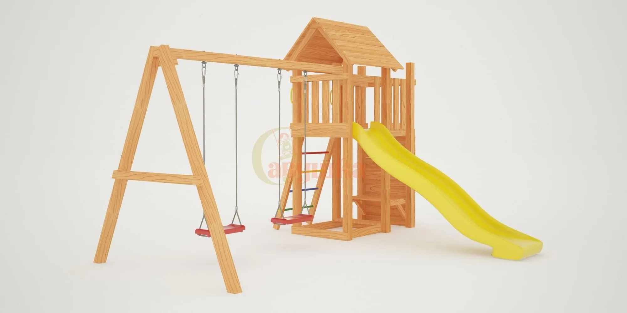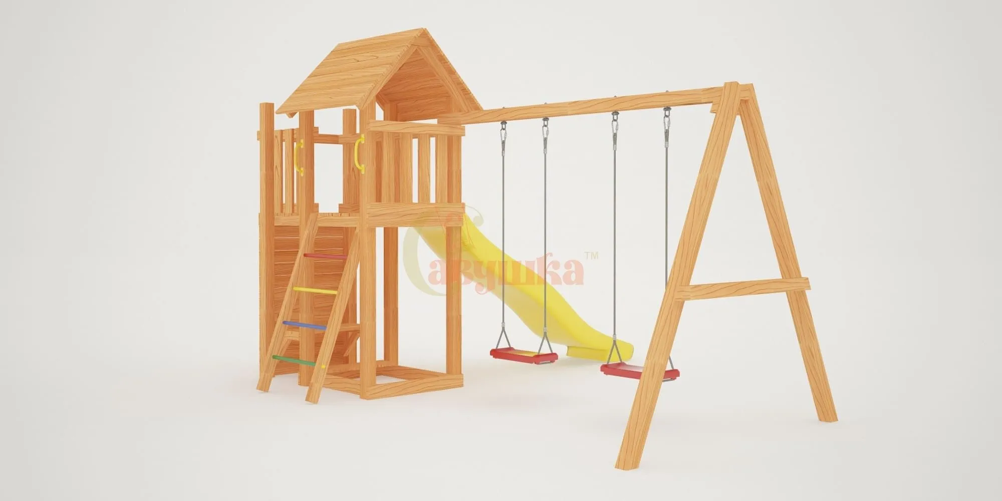 Комплекс безопасен: крепежные соединения надежно скрыты под колпачками, качельные подвесы выполнены по ГОСТ, спортивное бельгийское оборудование имеет дополнительный запас прочности.