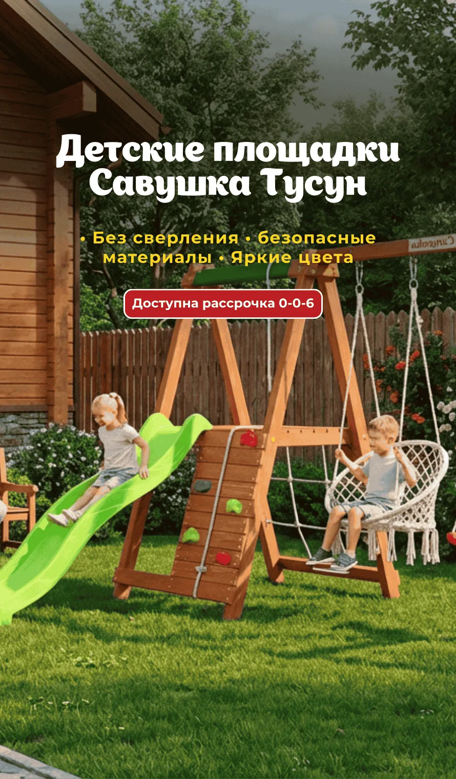 Игровые комплексы Савушка Тусун подходят для детей разного возраста и легко вписываются в ландшафт дачного участка или двора частного дома.