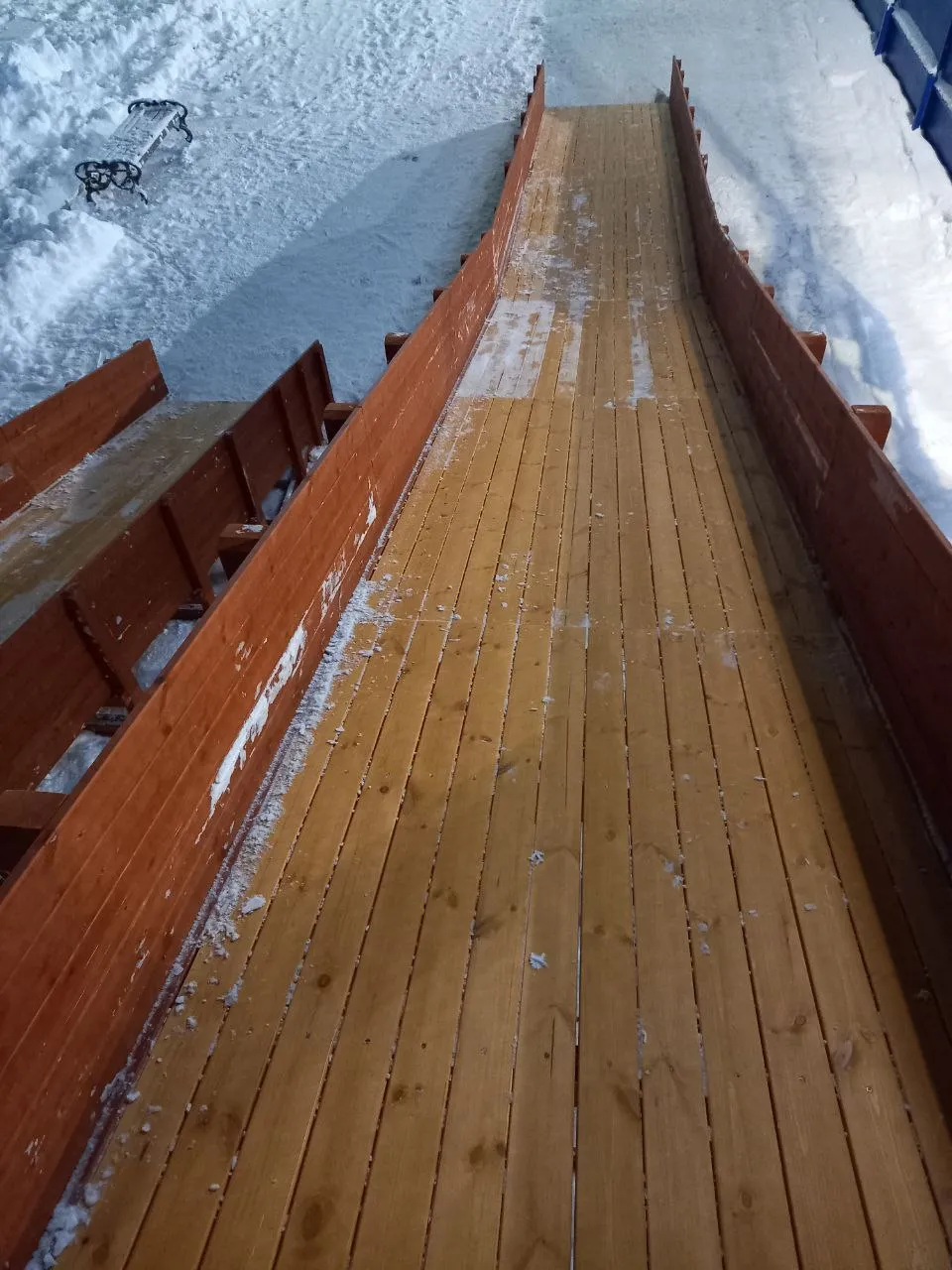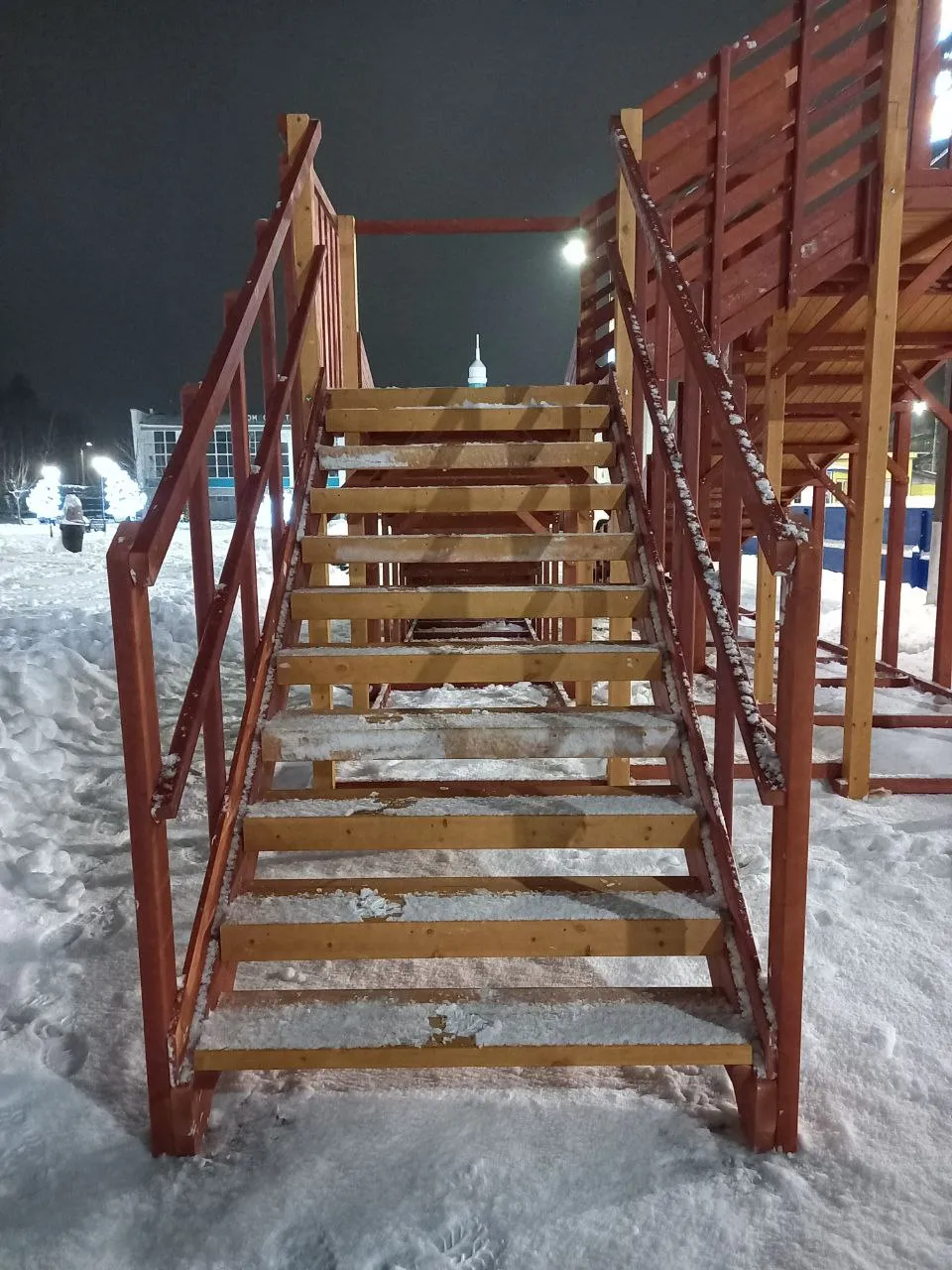 Основание горки — прочный клееный брус камерной сушки, который не трескается на морозе и выдерживает высокие нагрузки годами. Все поверхности тщательно отшлифованы и покрыты безопасным лакокрасочным составом на водной основе.
