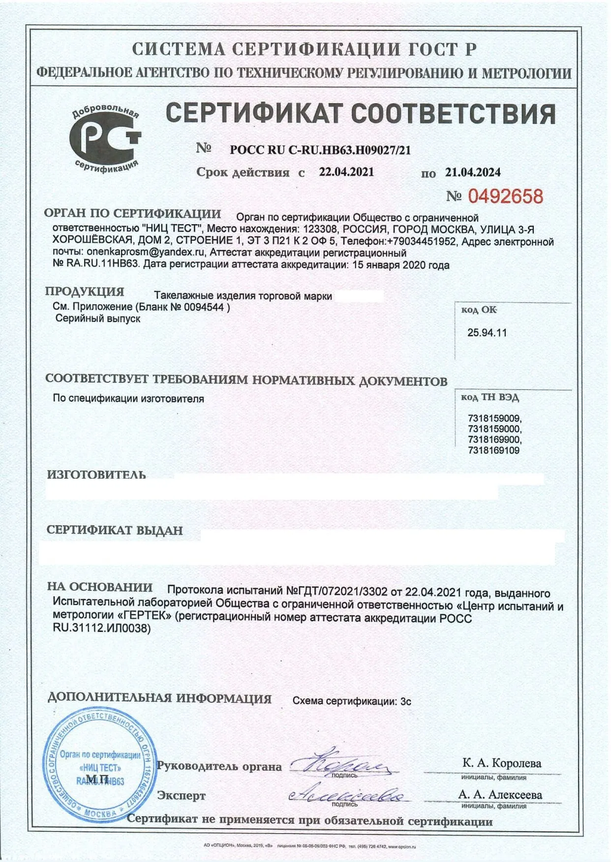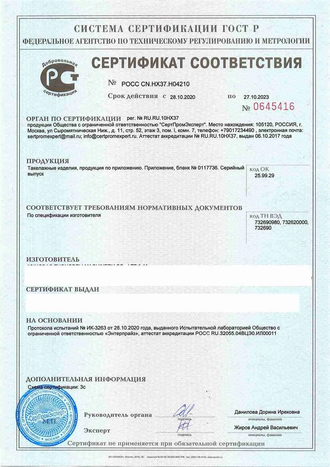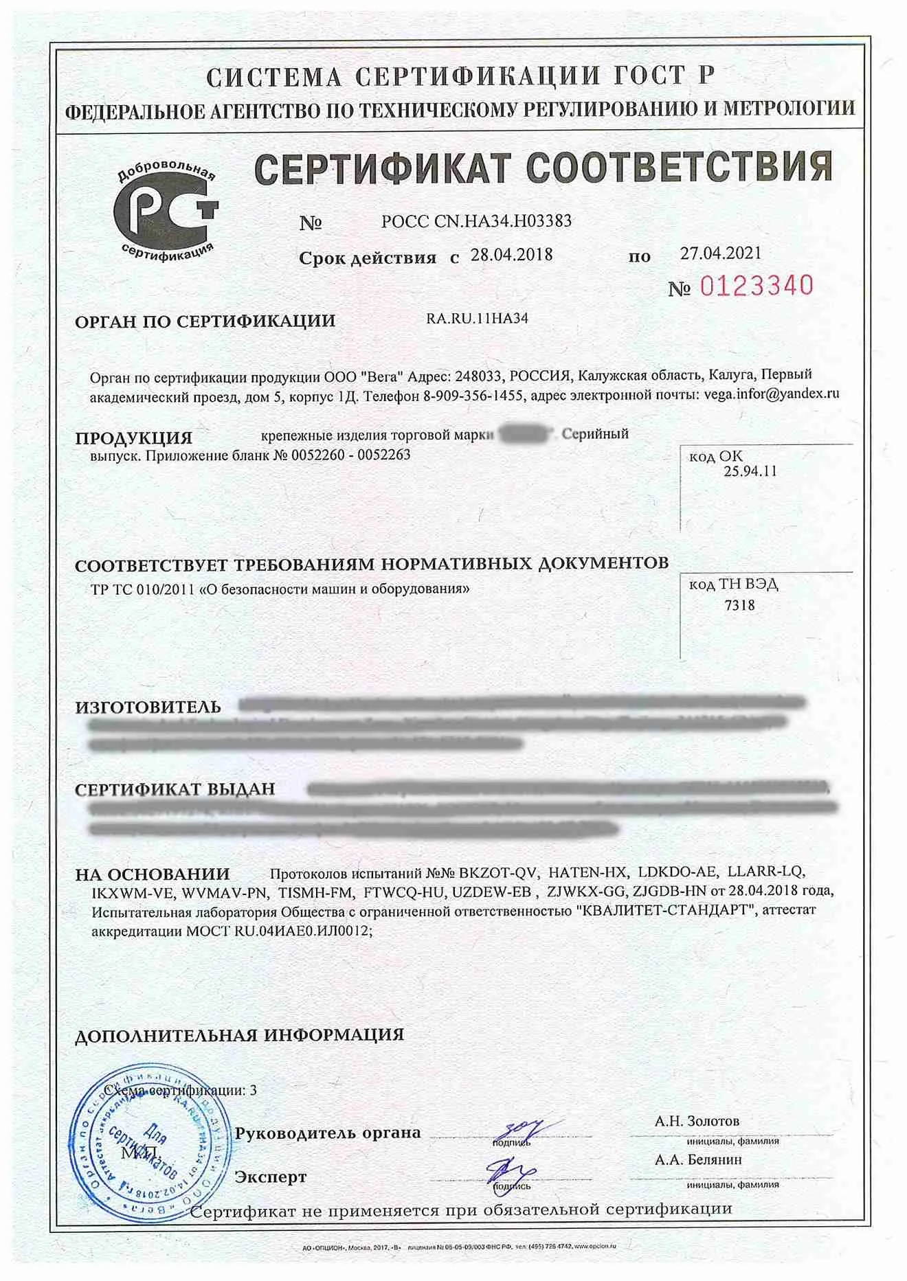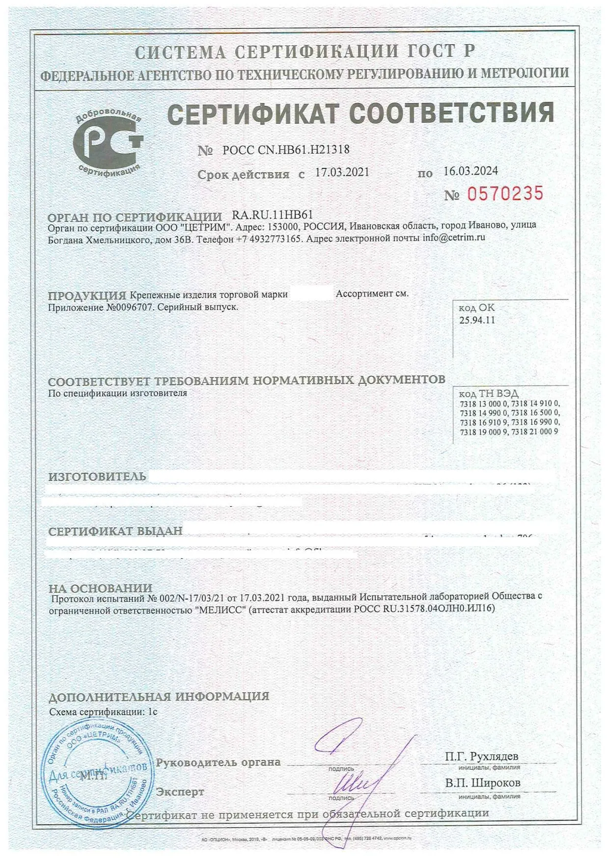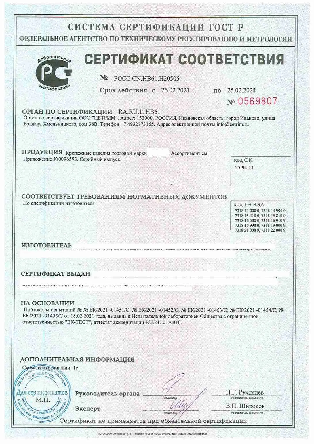 Сертификат соответствия ГОСТ Р на Крепеж