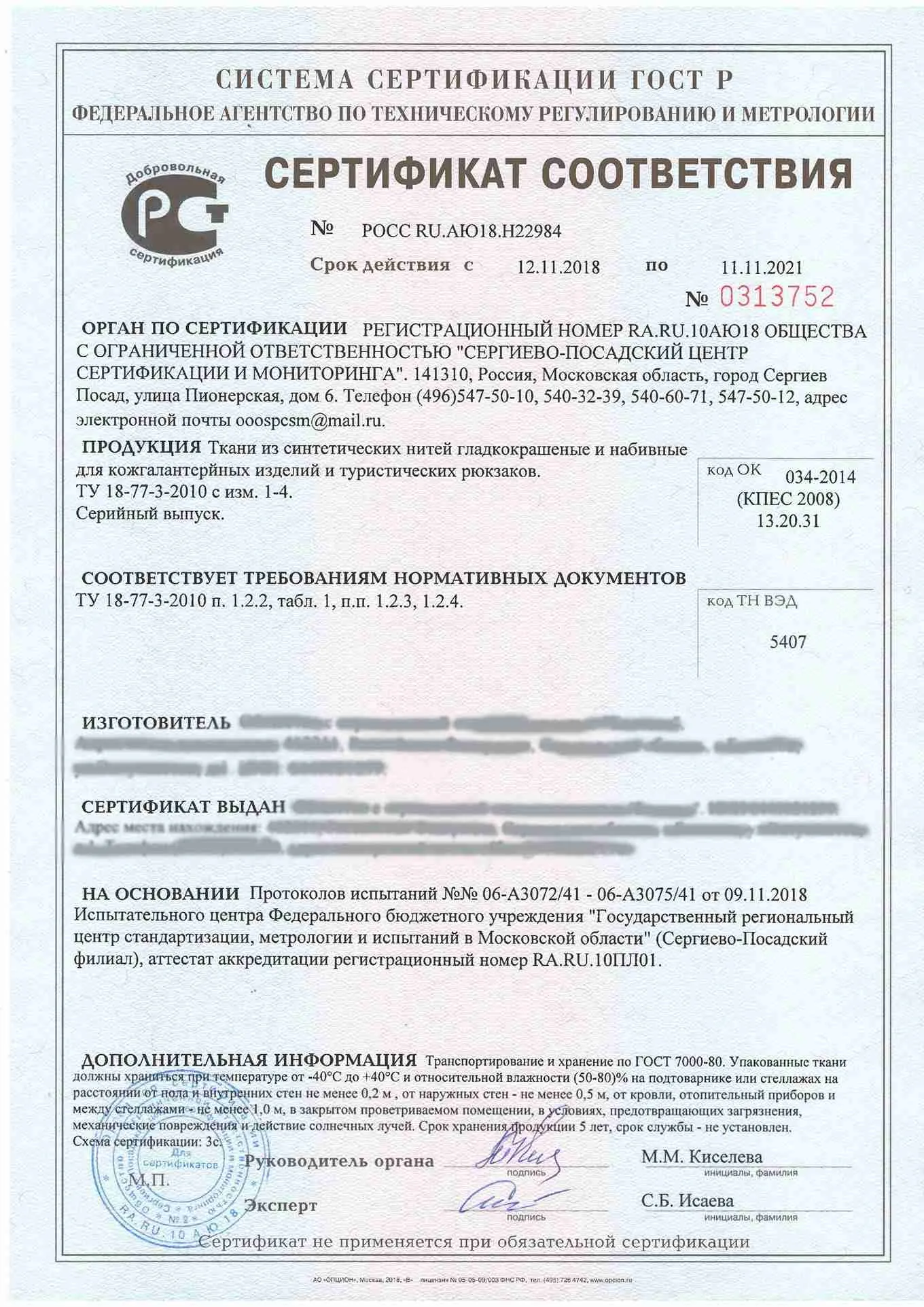 Сертификат соответствия ГОСТ Р на Ткани