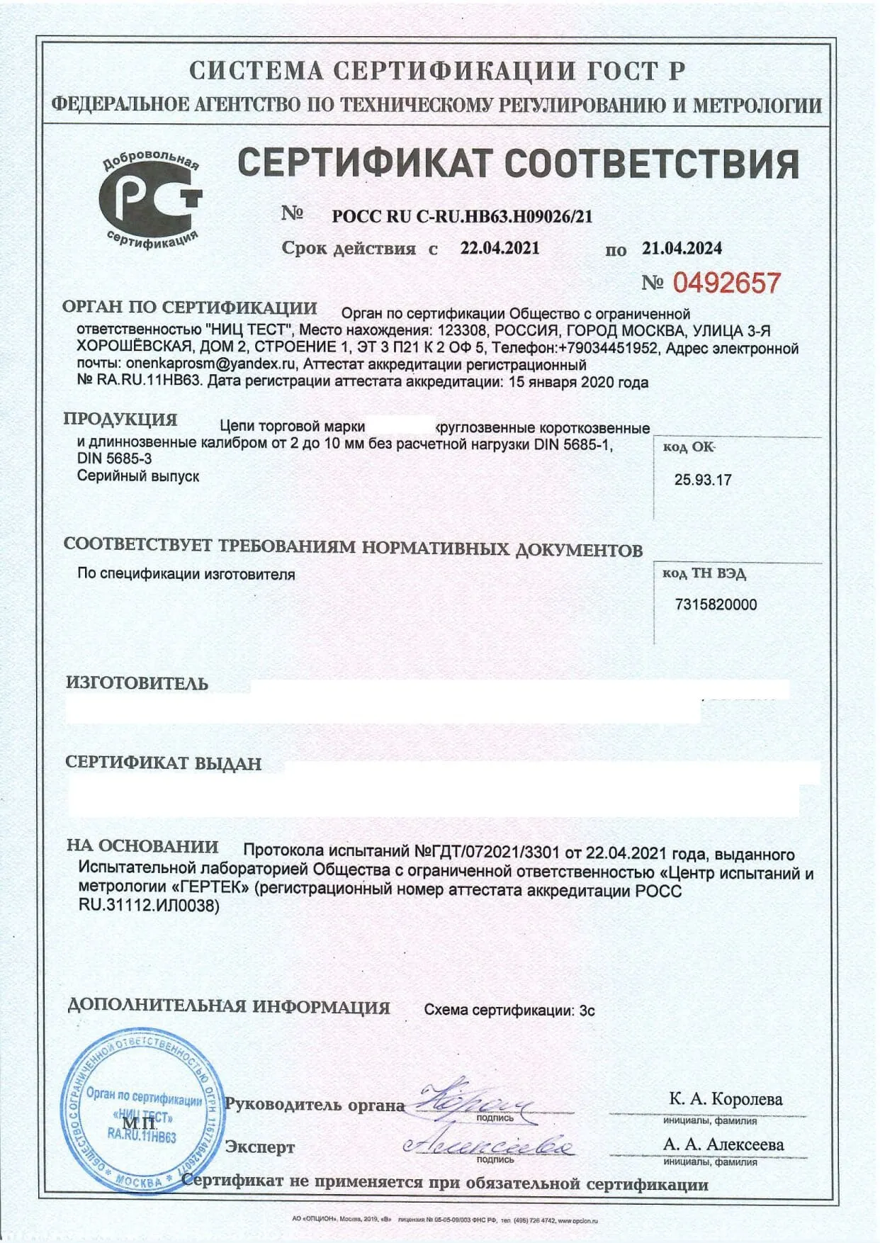 Сертификат соответствия ГОСТ Р на Цепи