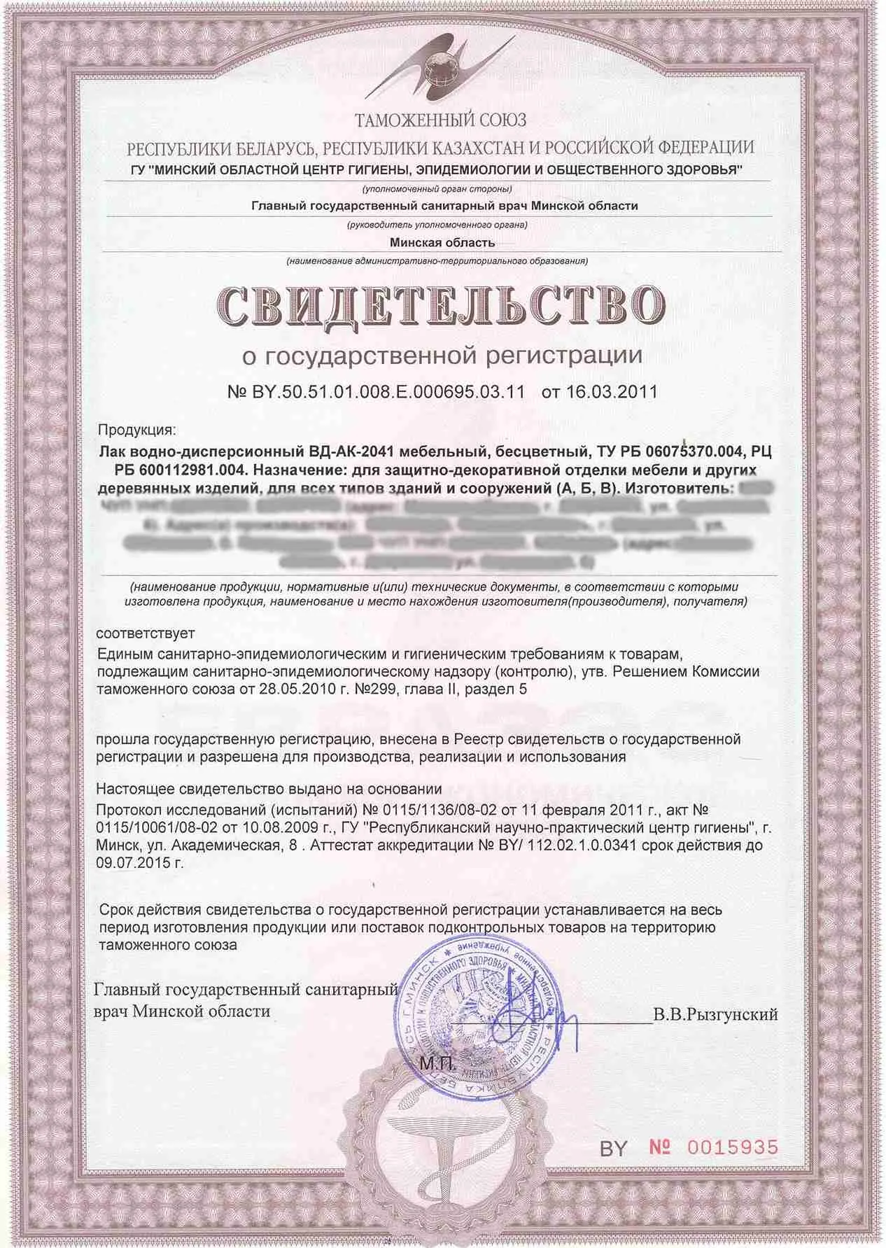 Сертификат соответствия СанПиН - Лак