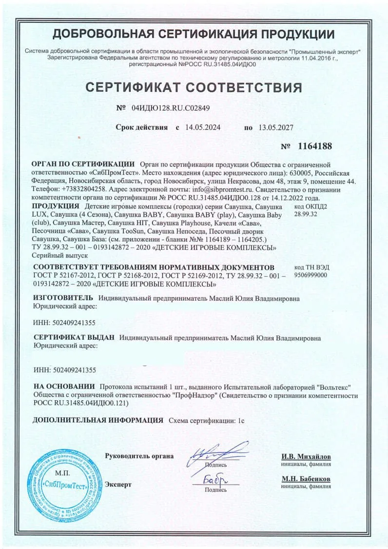 Сертификат о соответствии детских площадок Савушка КУБ